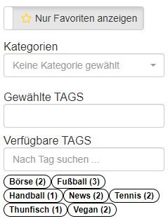 Hier stehen alle Schlüsselwörter die aktuell ausgewählt sind und nach denen gefiltert wird. Klicke auf das X neben einem Schlüsselwort um dieses aus dem Filter zu entfernen. - Verfügbare TAGS